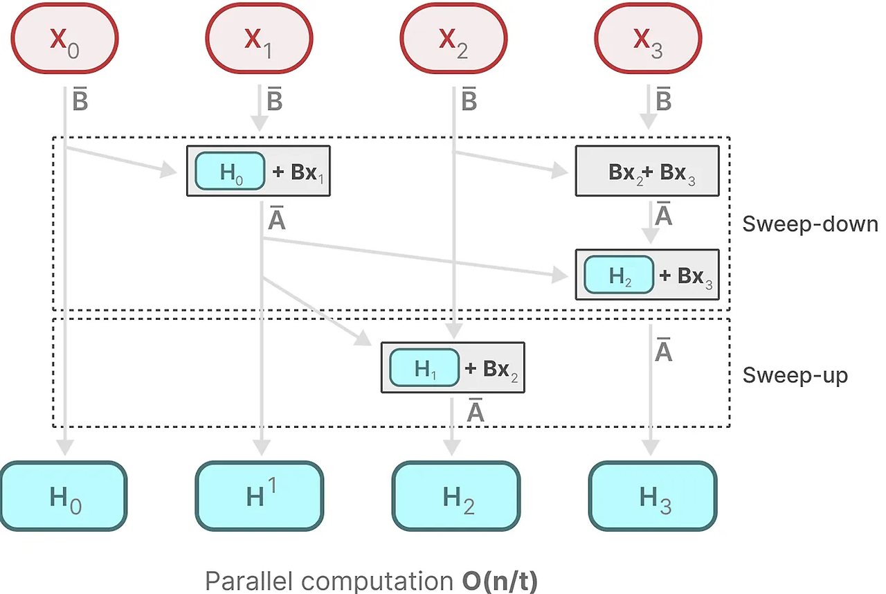 각 상태는 이전 상태(행렬 A에 의해 곱해진)와 현재 입력(행렬 B에 의해 곱해진)의 합입니다. 이것을 스캔 작업이라고 하며, for 루프를 사용하여 쉽게 계산할 수 있습니다. 병렬화와는 대조적으로, 이전 상태를 가지고 있어야만 각 상태를 계산할 수 있으므로 불가능해 보입니다. 그러나 맘바는 병렬 스캔 알고리즘을 통해 이것을 가능하게 합니다. 이것은 연산 순서가 중요하지 않다고 가정함으로써 수행됩니다. 결과적으로, 우리는 시퀀스를 부분적으로 계산하고 반복적으로 결합할 수 있습니다.