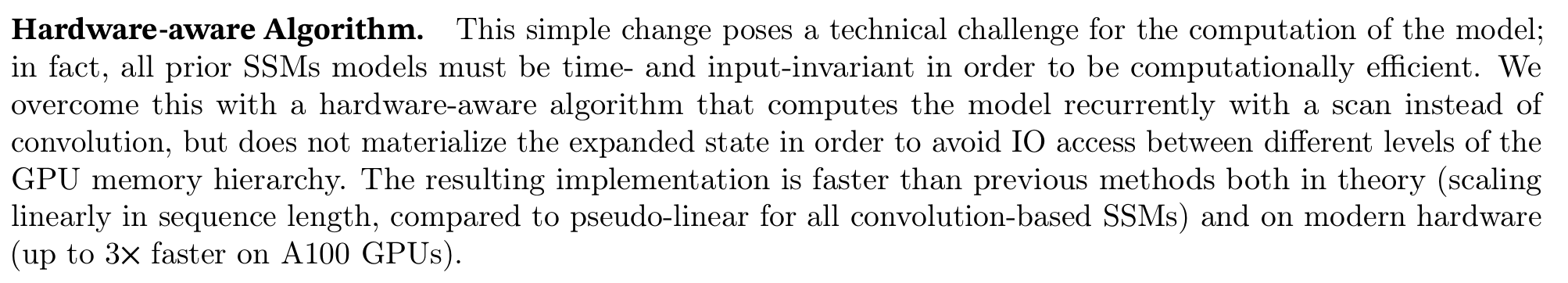 Mamba Contribution2. Convolution 대신 scan을 사용하여 모델을 반복적으로 계산하는 하드웨어 인식 알고리즘 제안합니다. a100 gpu 기준 최대 3배 더 빠릅니다.