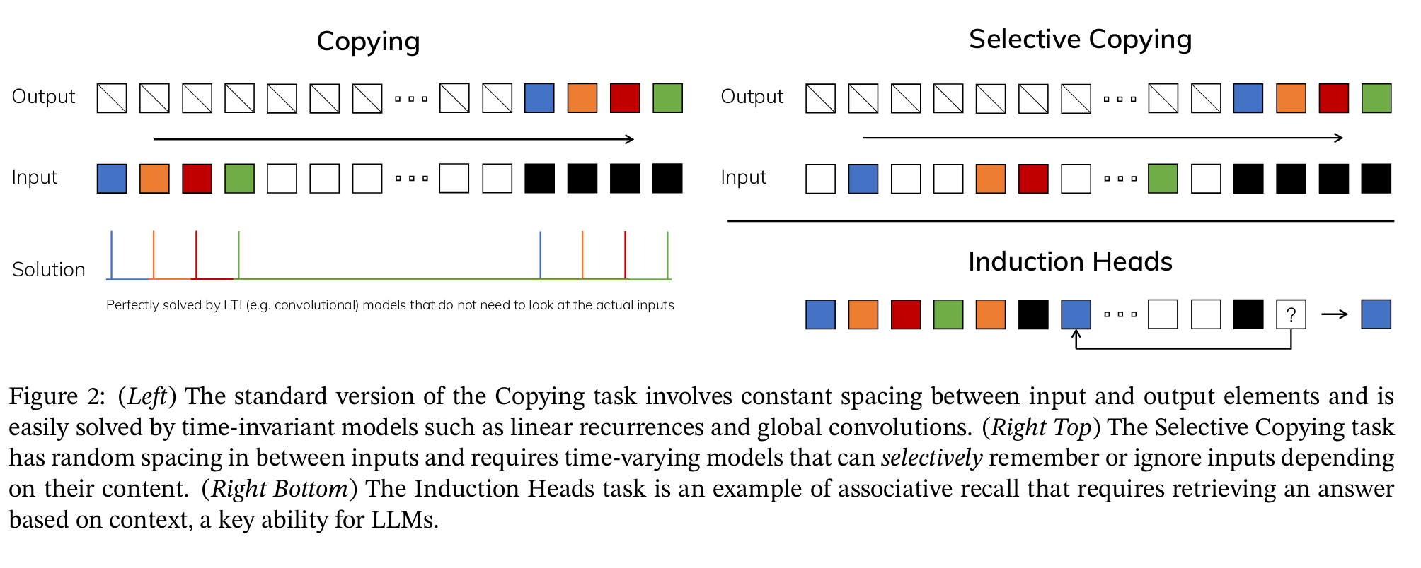 이는 선택적 복사(Selective Copying) 및 유도 헤드(induction heads)라는 두 가지 합성 작업으로 설명할 수 있습니다.