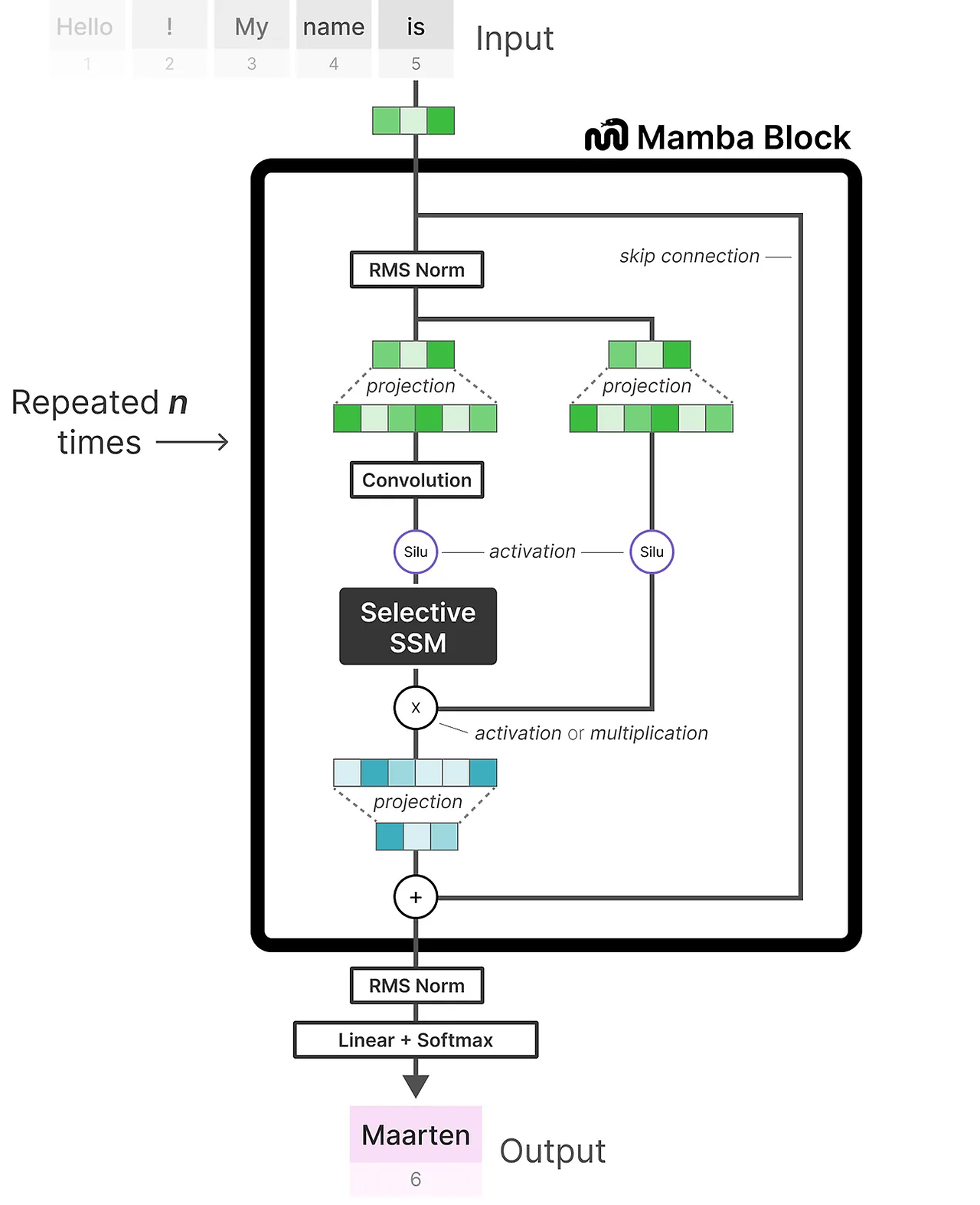 Mamba Block은 Selective SSM이 디코더 블록에서 self-attention을 나타내는 것과 같은 방식으로 블록으로 구현될 수 있습니다.
