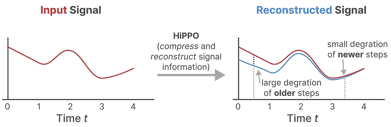 HiPPO를 사용하여 행렬 A를 구축하는 것은 무작위 행렬로 초기화하는 것보다 훨씬 나은 것으로 나타났습니다. 결과적으로, 이는 오래된 신호(초기 토큰)보다 새로운 신호(최근 토큰)를 더 정확하게 재구성합니다. HiPPO 매트릭스의 아이디어는 그것이 그 역사를 기억하는 숨겨진 상태를 생성한다는 것입니다. 수학적으로, 이는 르장드르 다항식의 계수(Legendre polynomial)를 추적함으로써 이전 역사의 모든 것을 근사화할 수 있게 함으로써 그렇게 합니다.